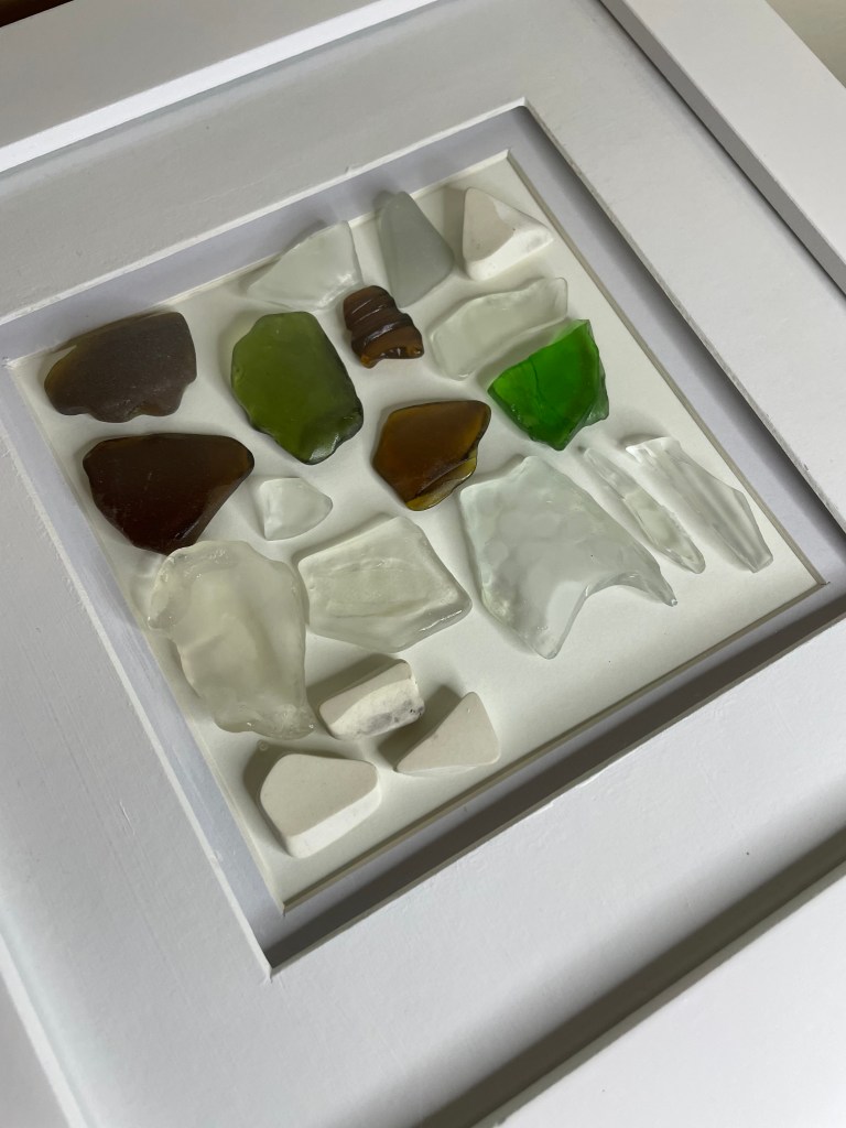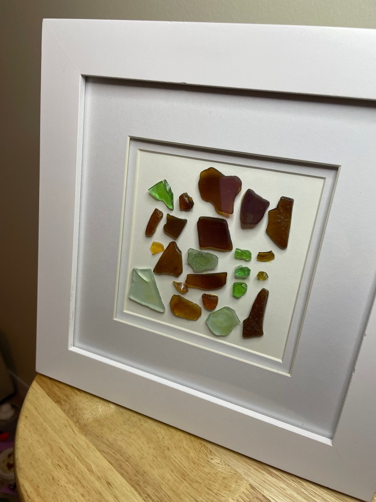 This is an original art piece and not a print. Sea glass is within the framing and is behind a pane of glass in the frame. (Photo is taken before the pane of glass is installed to eliminate glare.)
